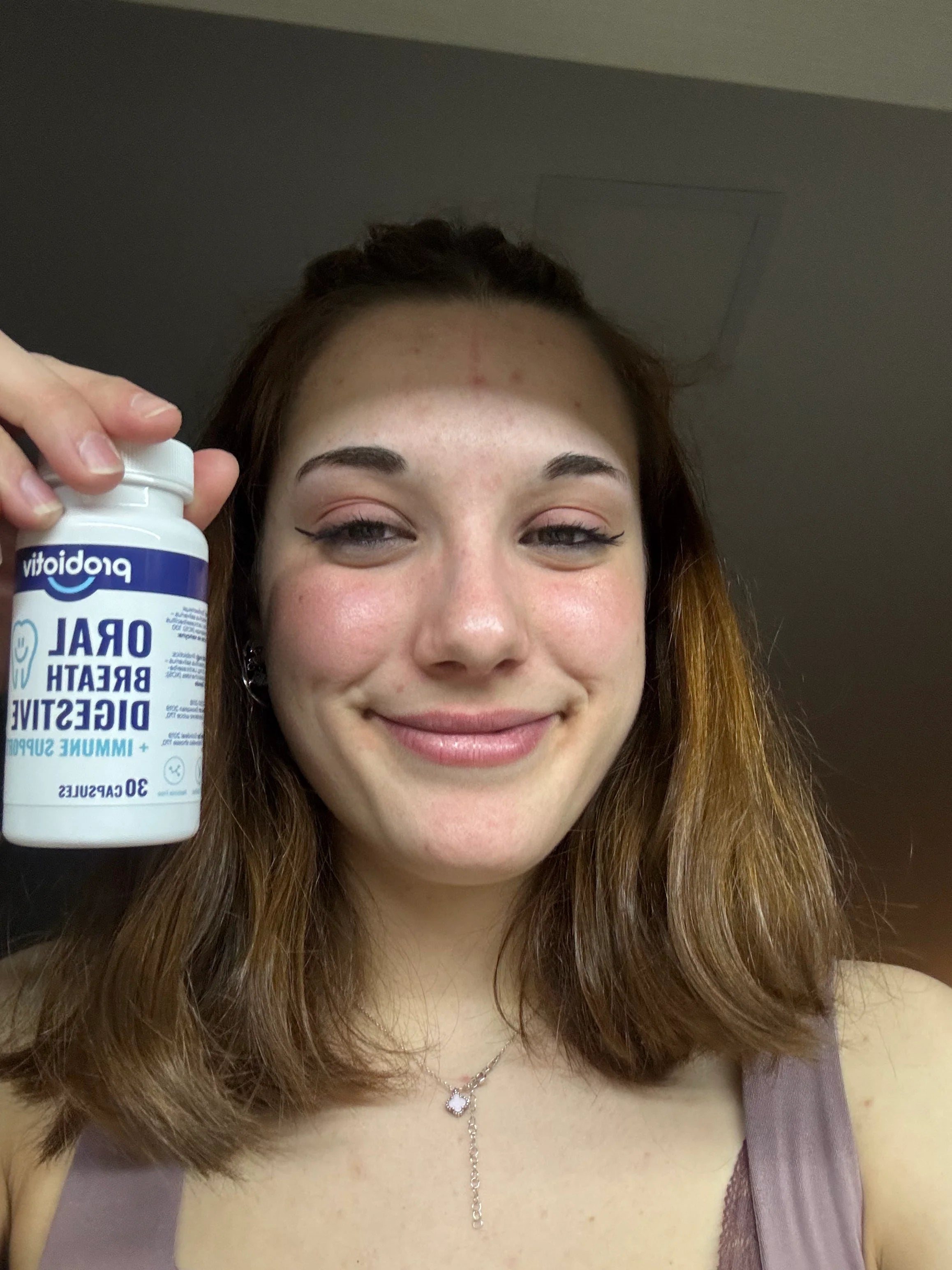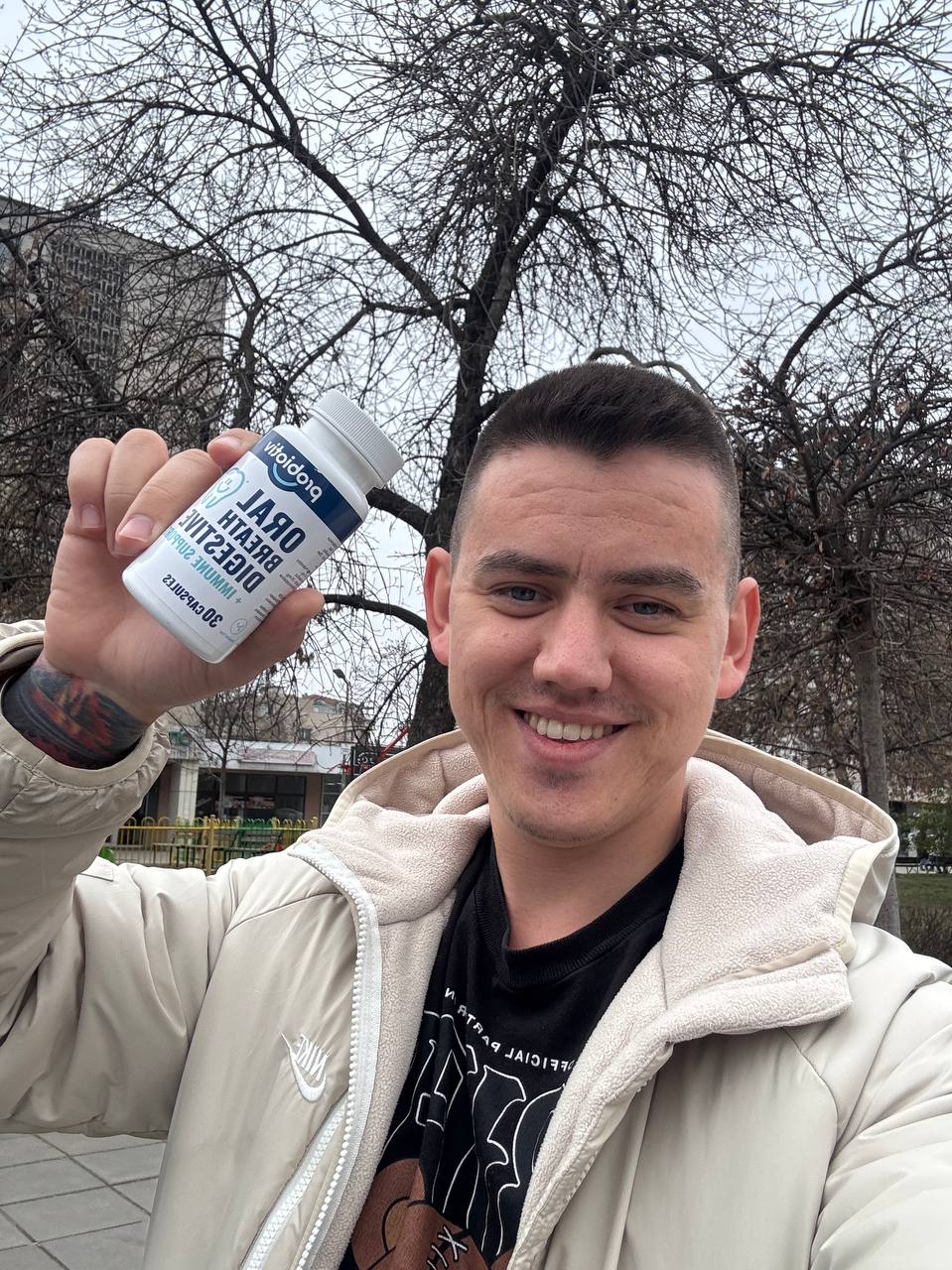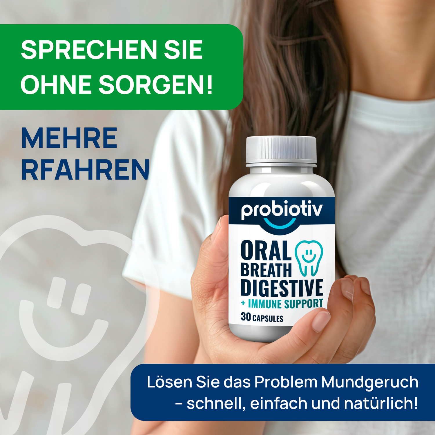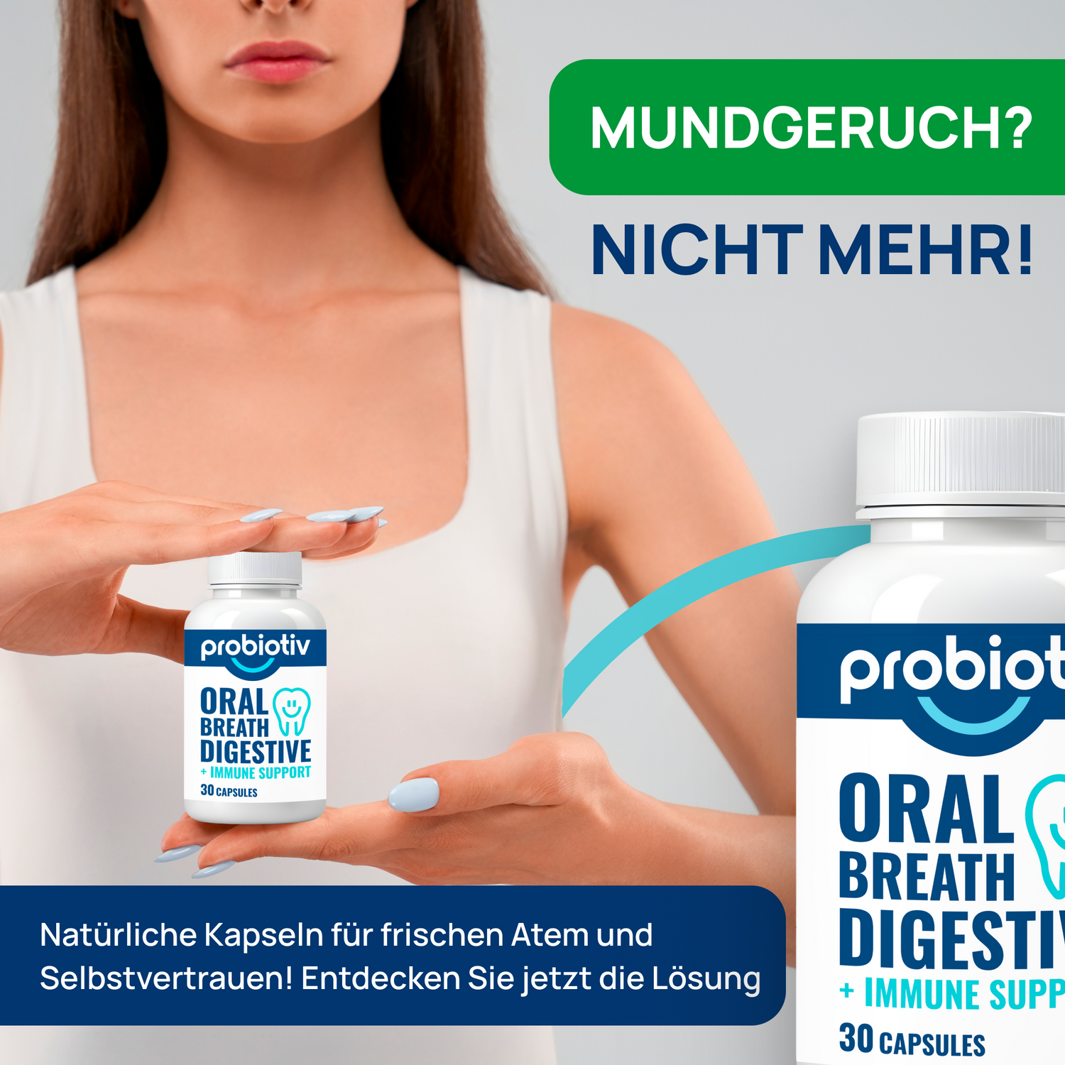 Hauptvorteile: Verbessert den Atem: Hilft, das Bakteriengleichgewicht in der Mundhöhle zu halten und reduziert Mundgeruch (Halitosis). Erhält die Mundhygiene: Schafft eine gesunde Mikroflora im Mund, die hilft, Zahn- und Zahnfleischproblemen vorzubeugen. Antibakterielle Wirkung: Reduziert schädliche Bakterien, die Entzündungen, Karies und Mundgeruch verursachen können. Stärkt das Immunsystem: Kombiniert die Kraft von Probiotika, um das Gleichgewicht im Körper aufrechtzuerhalten und seine Abwehrmechanismen zu stärken. Unterstützt die Verdauung: Die guten Bakterien in Probiotiv helfen, die Verdauungsprozesse zu optimieren und Magenbeschwerden vorzubeugen, die den Atem beeinträchtigen können. Sichere und natürliche Zusammensetzung: Probiotiv wird aus hochwertigen Inhaltsstoffen hergestellt, die für die langfristige Anwendung sicher sind. Wählen Sie Probiotiv für eine gesunde Lösung für frischen Atem und eine allgemeine Verbesserung der Mundhygiene!